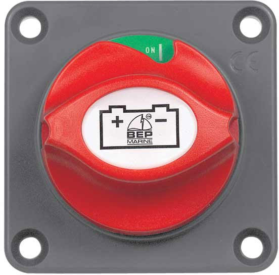 Hovedstrømsbryter fra BEP av meget høy kvalitet. 275A konstant. 1250A/15 sekunder. Monteres flush ved å lage et 52 mm hull. Nøkkel kan fjernes. IP=67. Max = 48V DC.