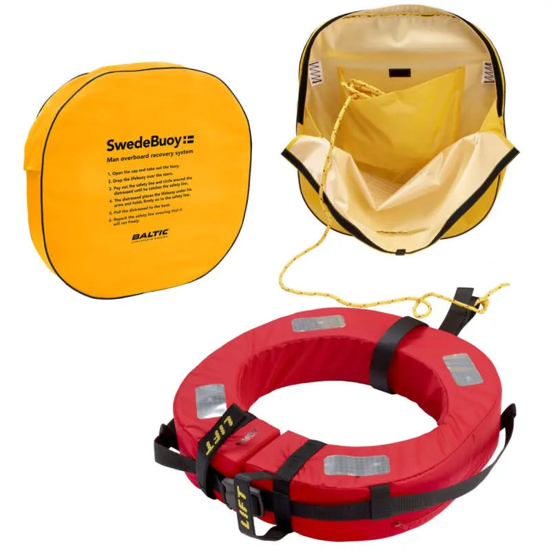 Unikt mann-over-bord-system som inneholder livbøye og line på 30 meter pakket i en praktisk oppbevaringspose. Swedebuoyen monteres enkelt ved hjelp av fire festeband på innsiden pushpit, uten bruk av verktøy.